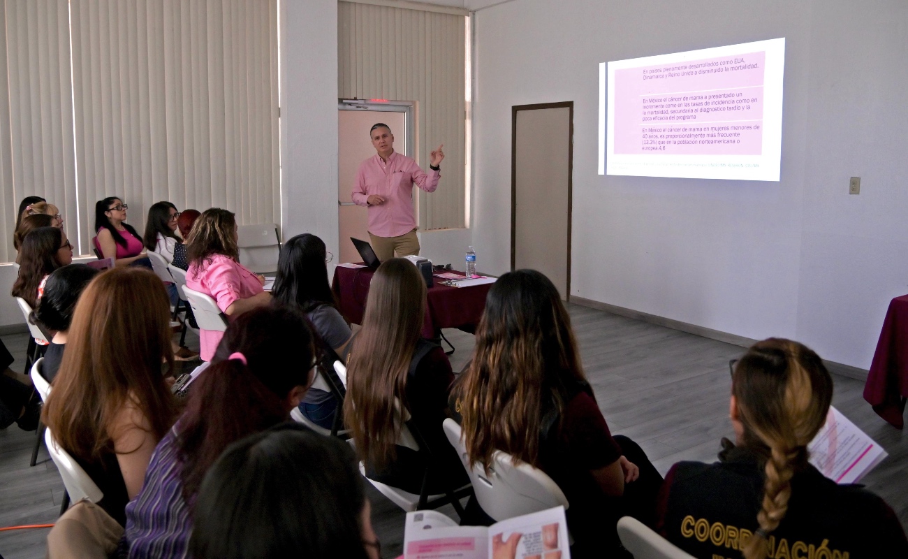 MEXICALI.- En el marco del “Mes de la sensibilización de la lucha contra el cáncer de mama”, por instrucciones del titular de la Comisión Estatal del Sistema Penitenciario de Baja California (CESISPE), José Gabriel Gálvez Beltrán, en una acción coordinada con el ISSSTECALI, a través de la Jefatura de Promoción y Fomento de la Salud, a cargo de Dra. Jennifer Wong Martínez y con la colaboración del Médico Ginecólogo Adscrito al Hospital Materno Infantil del IMSS Bienestar, Óscar Vicente López Macías como ponente, se impartió la charla “Importancia de la detección oportuna del cáncer de mama”, al personal laboral femenino.