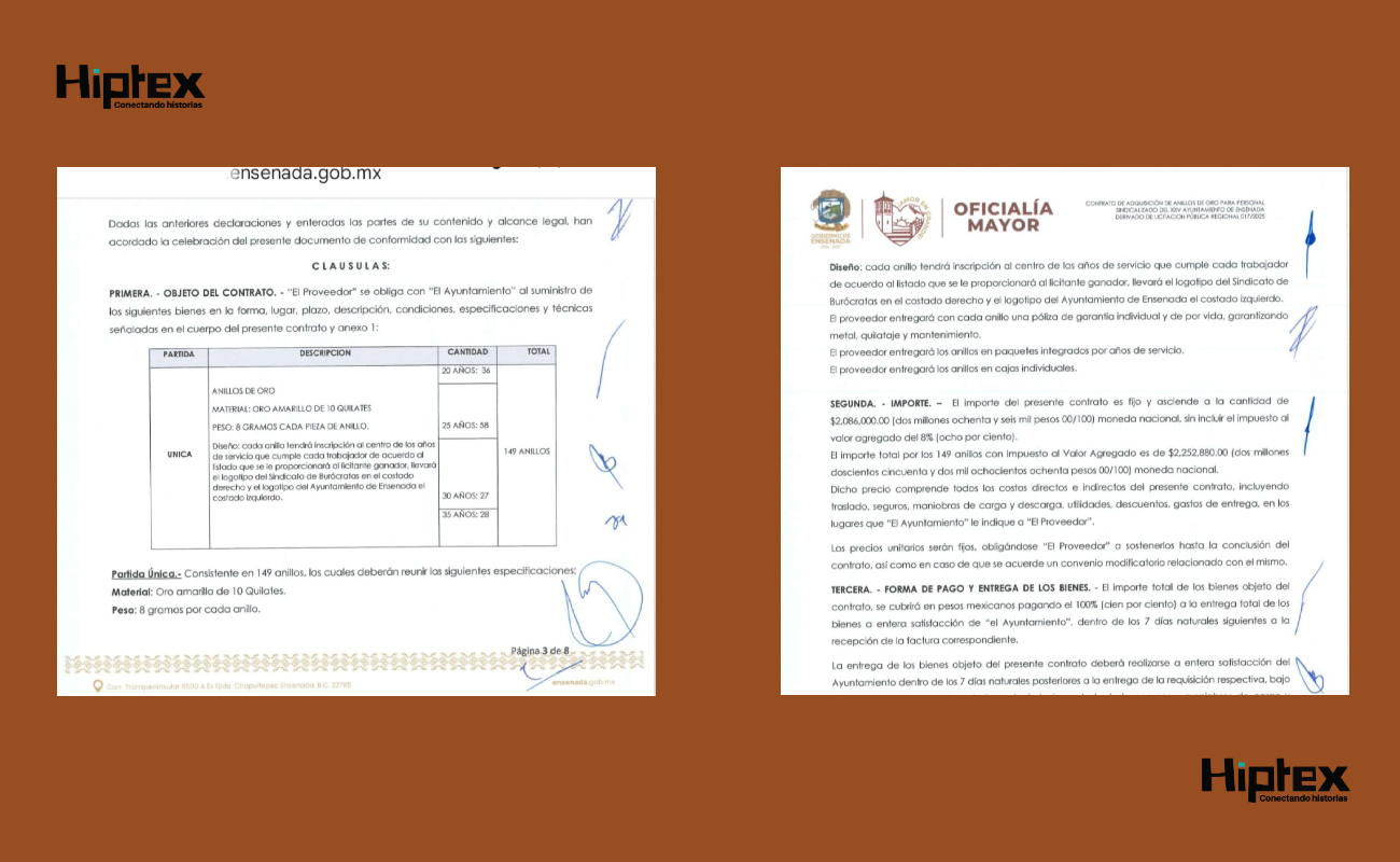 Cada anillo, según se especificó en el contrato disponible en Transparencia, tendrá la inscripción al centro de los años de servicios que cumple cada trabajador de acuerdo con el listado que se le proporcionará al licitante ganador, llevará el logotipo del Sindicato de Burócratas en el costado derecho y el logotipo del Ayuntamiento de Ensenada al costado izquierdo.