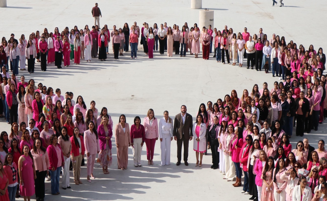 Ismael Burgueño Ruiz, junto a las mujeres que conforman el XXV Ayuntamiento, formaron un listón rosa como muestra de unión, esperanza y compromiso en favor de la salud preventiva