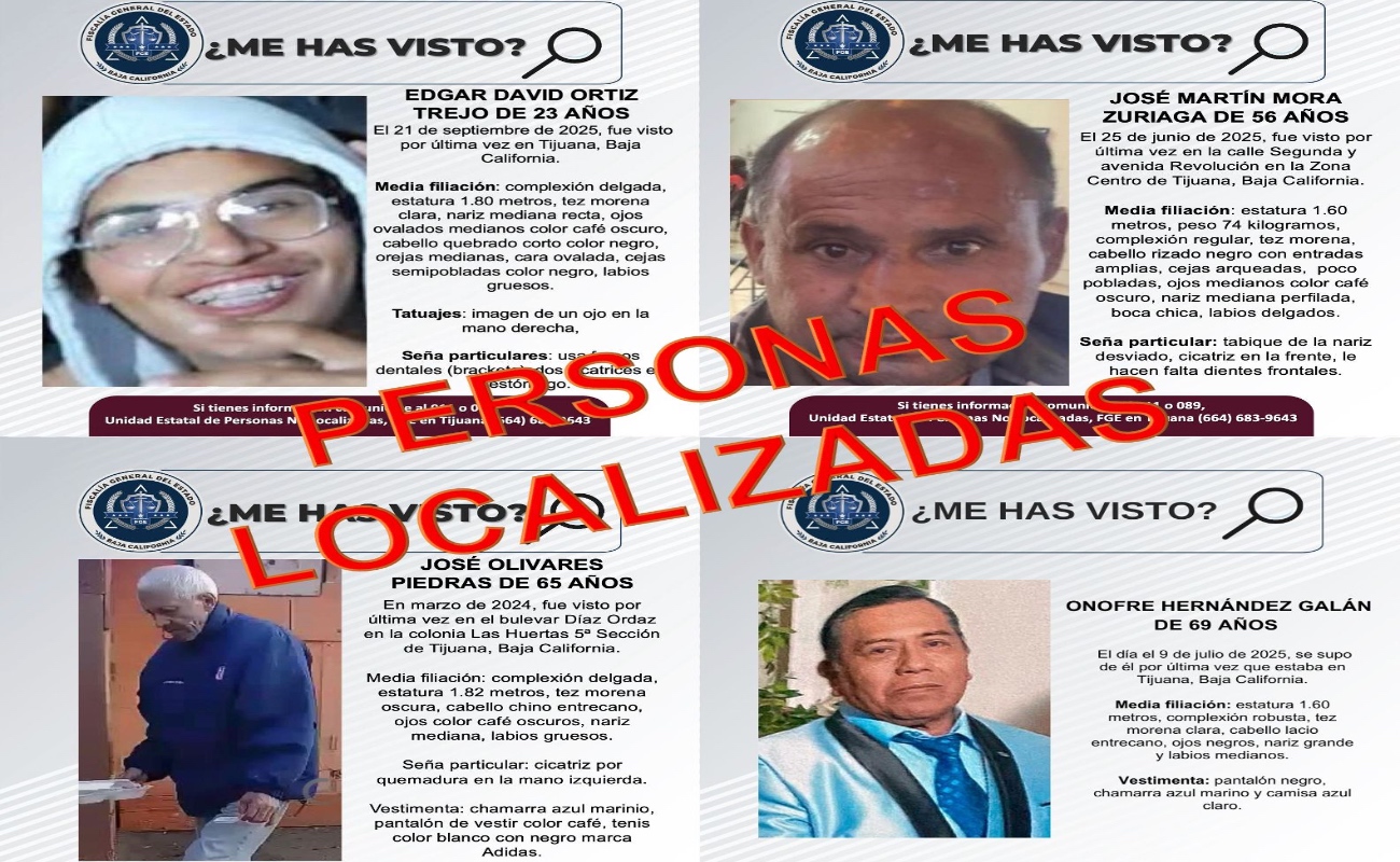 TIJUANA.- Agentes estatales de investigación localizaron a cuatro personas que habían sido reportadas como desaparecidas.